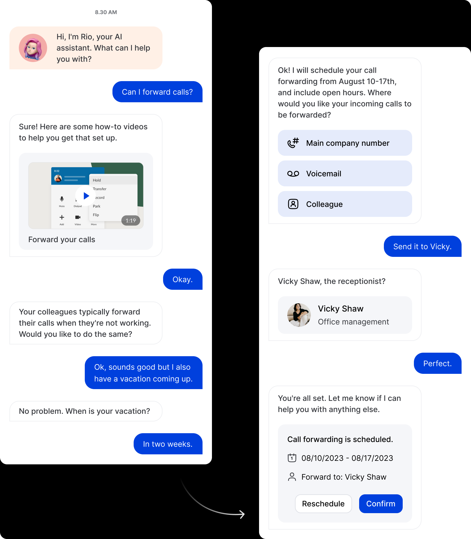 Before scheduling call forwarding, the assistant summarizes the date range and the destination.